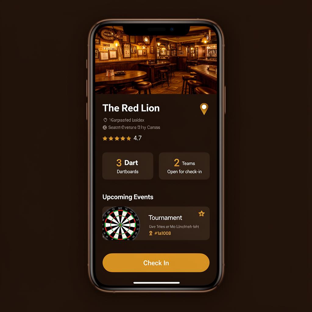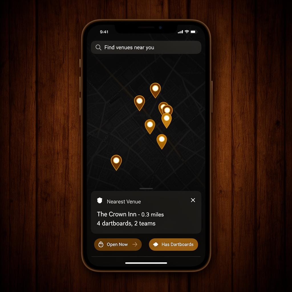 Your venue appears on the DartDock discovery map. Players can see your dartboard count, teams and upcoming events before they visit.